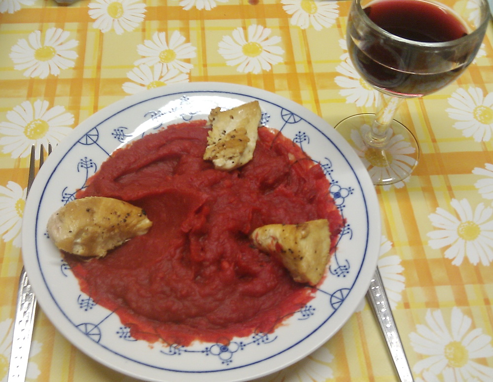Passend zur heutigen Ernte gab es dann Kürbis-Kartoffel-rote-Bete-Mus mit gebratener Hühnerbrust (nein, das ist kein Teller voll Ketchup). Der leicht erdige Bete-Geschmack macht das Kürbismus etwas herzhafter und ergibt eine interessante Geschmacksmischung.